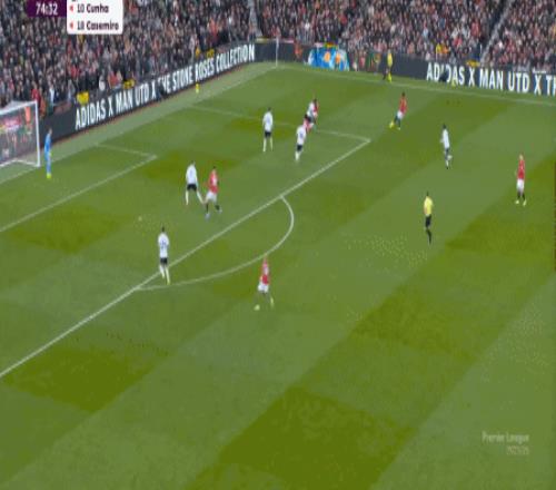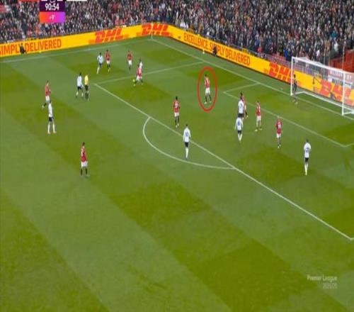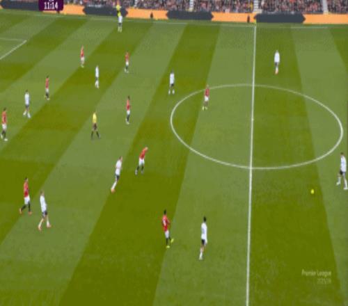 这个时候的曼联,却没有典型的中锋球员可以直接寻找,以此来在重压之下打出一个缺口,只能是等到富勒姆势头消退,来到前场之后,用梅努的斜传来寻找插上的布鲁诺,以此来打一次反制: